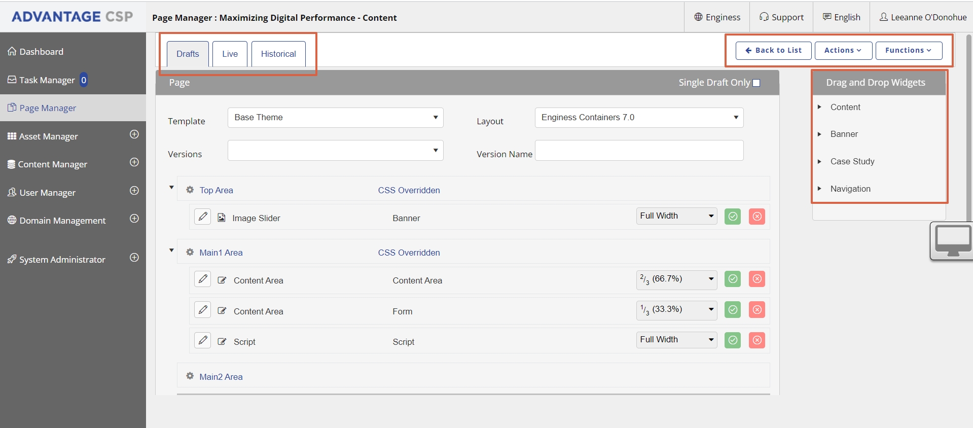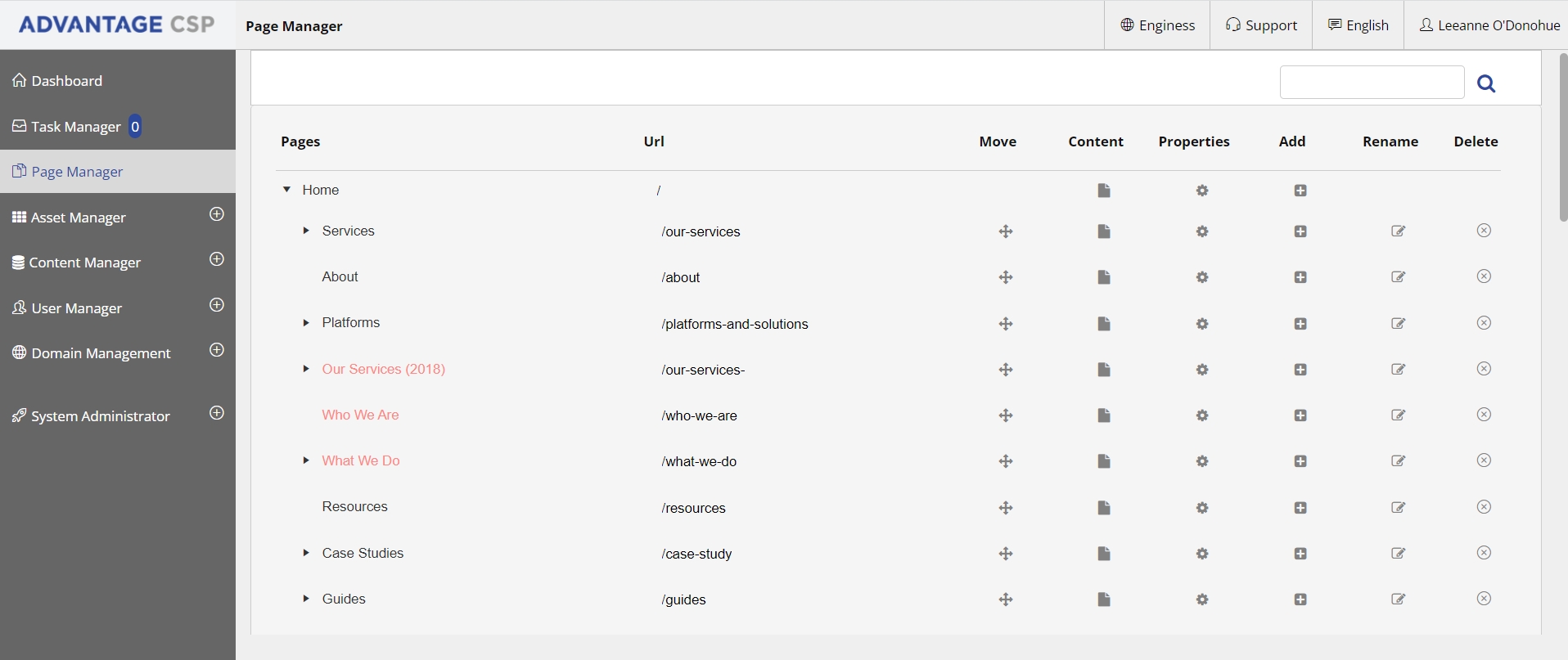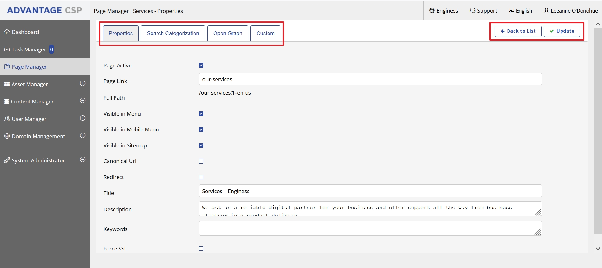 Page Manager Overview Page Manager The Page Manager is where you can view your website’s site structure as it lists all your pages in a navigation tree. The small grey arrow beside a page name is used to expand that section and see the other pages within it. Topics covered in this article: Move Content Properties Add Rename Delete Across the top of the Page Manager view you will see the options of Move, Content, Properties, Add, Rename and Delete. The Home page cannot be moved, renamed, or deleted. More on these options below. Move By clicking the Move icon in the row of a page you wish to move it will highlight the row blue and while holding the left mouse button you can now drag the page to place it in the navigation tree where you need it. Look for the thin grey line below the page you wish to position the page you are moving and release the left mouse button. In the example below the Reading page is being dragged and moved between the Travel and Food page as the thin grey line shows where it will be placed when the mouse button is released. Note: this is move is done live and takes effect immediately. A refresh of the active page on your website will show the change made. Content Pressing the icon for Content will take you to the Content window for that website page and you will see near the top left Draft, Live and Historical Tabs. On the top right are the Back to List, Actions and Functions buttons. A panel of Drag and Drop Widgets is also in the top right of the Content window. Note: Do not the browsers back arrow to return to the Page Manager view as this take you to a different page within Advantage. Instead use the Back to List whenever you see it near the top right of the page. A more detail look at all the features of the Content window and how to use them is found in this article, Page Manager: Content. Properties Pressing the Properties icon takes you to the Properties window for that website page and you are presented with the Properties, Search Categorizations, Open Graph and Custom Tabs near the top left of the window. On the top right you will see the Back to List and Update buttons. A more detail look at all the features of the Properties window and how to use them is found in this article, Page Manager: Properties. Add Adding pages to your website's structure is easily done with the Add button. Once clicked the Add Page dialogue box opens where you will name the page and can choose to duplicate the same formatting and structure of a current page by selecting one from the Page to copy from drop-down menu, or click Blank. Click save and the page will added to the navigation tree. You can then go into Content to make any further changes to the new page you have added. Rename By clicking on the Rename icon a small window pops up and you simply type the new name of the page and click OK. Delete To delete a page from your website simply click on the Delete icon, a small window will ask you to confirm that you wish to delete that page. Editing Page Settings Editing Page Settings Here you will be able to edit Page Settings such as Page Title, Description, Keywords. Control Menu Settings and advance functions like Search Categorization, Open Graph and any custom features. Creation Date: March 26, 2024 Created By: Oren Shapiro View most recent version # Edit Page Settings in Advantage 1. Click on Properties 2. Click on Properties 3. Check / Uncheck Page Active Active or Deactivate your page. Active means users can view the webpage. 4. Click on Page Link Here you can create 'Friendly URLs' - separate words with dashes (-) instead of spaces or symbols. Make sure to remove apostrophes and any special characters. 5. View Full Path Here you can view what the URL Path will look like after you name your page link. 6. Check Visible in Menu Determine whether you want this page to be visible in menu. 7. Check Visible in Sitemap Determine whether you want this page to be visible in Sitemap. 8. Check Canonical URL Determine whether you want this page to be a canonical URL. A canonical URL is the preferred URL for a specific piece of content when multiple URLs exist that point to the same content or similar variations of it. With this feature, when checked off, you are telling search crawlers like Google for example that this page, this content is designated as the authoritative or primary URL for search engines to index and rank. 9. Check Redirect If this page is a redirect. Check it off and new options will appear to configure the redirect. 10. Select Page Select the page you want this redirect to go to. 11. Click on Select A modal will open allowing you to access the Page Manager, navigation tree. 12. Select Redirect Type Select Permanent or Temporary Redirect. Permanent Redirect (301): Status Code: 301 Moved Permanently Meaning: Indicates that the requested URL has permanently moved to a new location. Use Case: Employed when a website permanently redirects one URL to another, typically because the original URL no longer exists or has been replaced by a new one. SEO Impact: Search engines treat 301 redirects as a signal to pass the ranking authority (link juice) from the old URL to the new one. It's considered a best practice for preserving search engine rankings when changing URLs. Temporary Redirect (302): Status Code: 302 Found (or 307 Temporary Redirect in HTTP/1.1) Meaning: Indicates that the requested URL has temporarily moved to a different location. Use Case: Used when a URL is temporarily redirected to another URL. It implies that the original URL may be restored in the future. SEO Impact: Search engines may not pass link equity from the original URL to the temporary one. If the redirect is expected to be permanent, using a 301 redirect is recommended for SEO purposes. 13. Click on Title Edit the SEO Page Title 14. Click on Description Edit the SEO Page Description 15. Click on Keywords Edit the SEO Page Keywords 16. Uncheck Force SSL If you don't have SSL on all parts of your